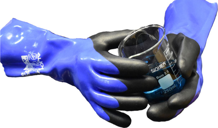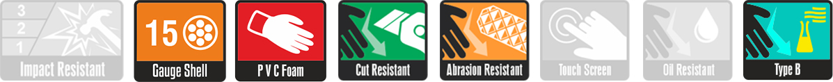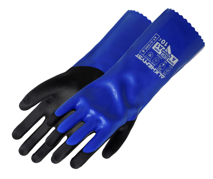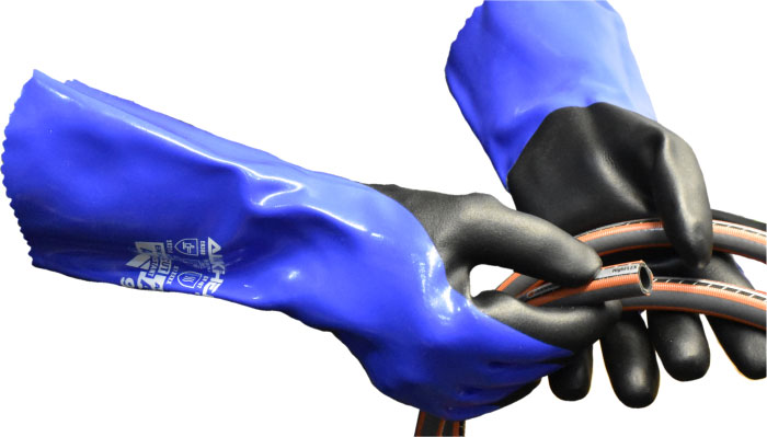 Chemical Resistant Gauntlet. Fully dipped PVC base layer on a 15g nylon comfort liner with a Textured PVC Foam Palm secondary coating that offers performance grip in dry, wet, and slippery conditions.