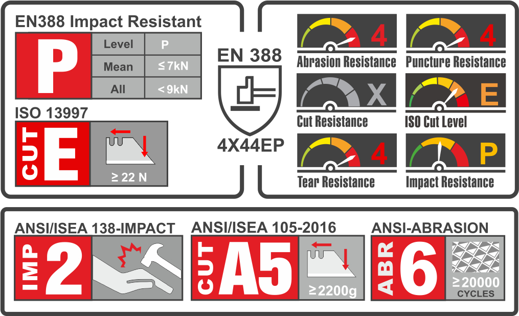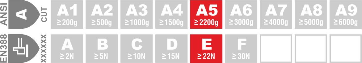 • Abrasion 4, Cut 5, Tear 4, Puncture 4 – EN388:2003