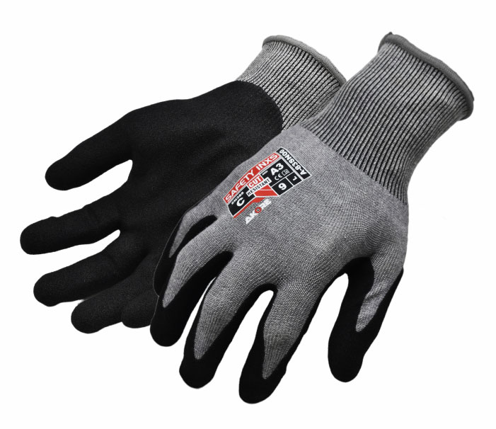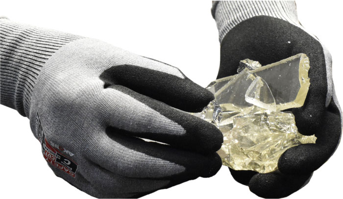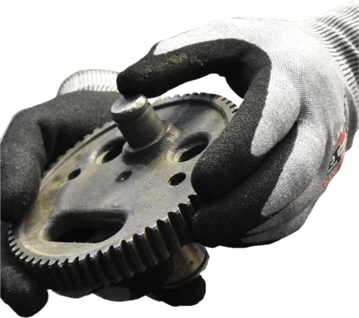 Skin fit, ultra-flyweight seamless precision cut resistant glove with a palm dipped Sandy Nitrile coating that offers good abrasion and oil resistance combined with performance grip and dexterity for the precise handling of small components and apparatus in wet, oily and slippery conditions.