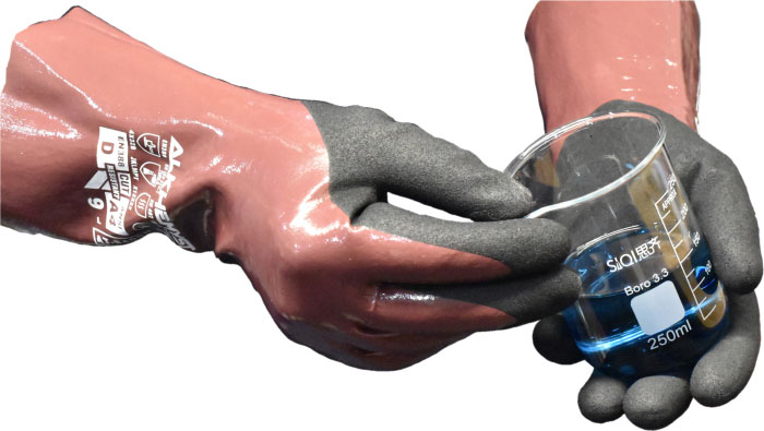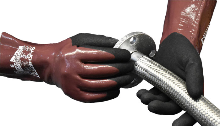 Chemical ‘N’ Cut Resistant Gauntlet. Fully dipped Nitrile base layer on a 18g cut resistant liner with Sandy Textured Nitrile Palm secondary coating that offers performance grip in dry, wet, and slippery conditions.
