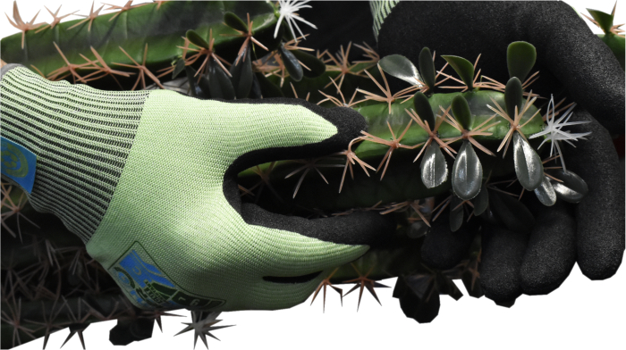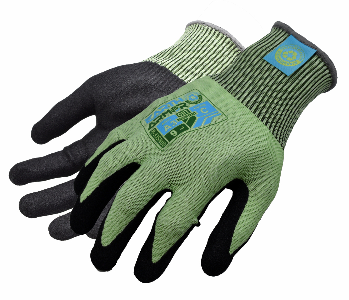 Recycled Content (RCS / GRS) ‘Green’, lightweight seamless precision cut resistant glove with a palm dipped Sandy Nitrile coating that offers good abrasion and oil resistance combined with performance grip and dexterity for the precise handling of small components and apparatus in wet, oily and slippery conditions.